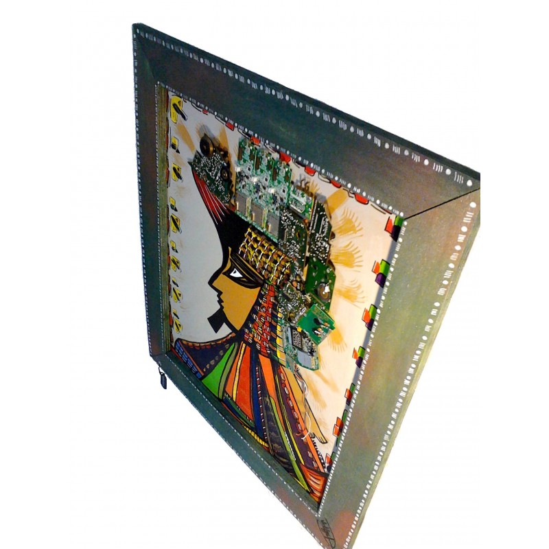 Mixed technics on wood, unique art work, Painting, handmade, wooden, wooden frame, printed circuit, back/felt