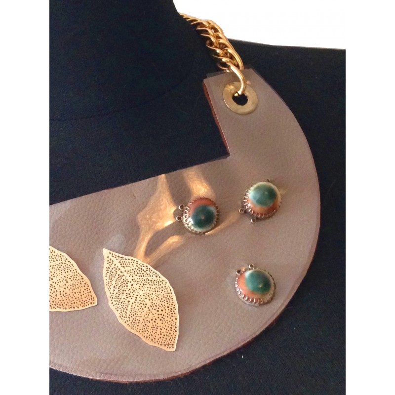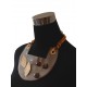 Plastron necklace, brown imitation leather, resin, plastic, golden & silver metal, clasp stainless steel.