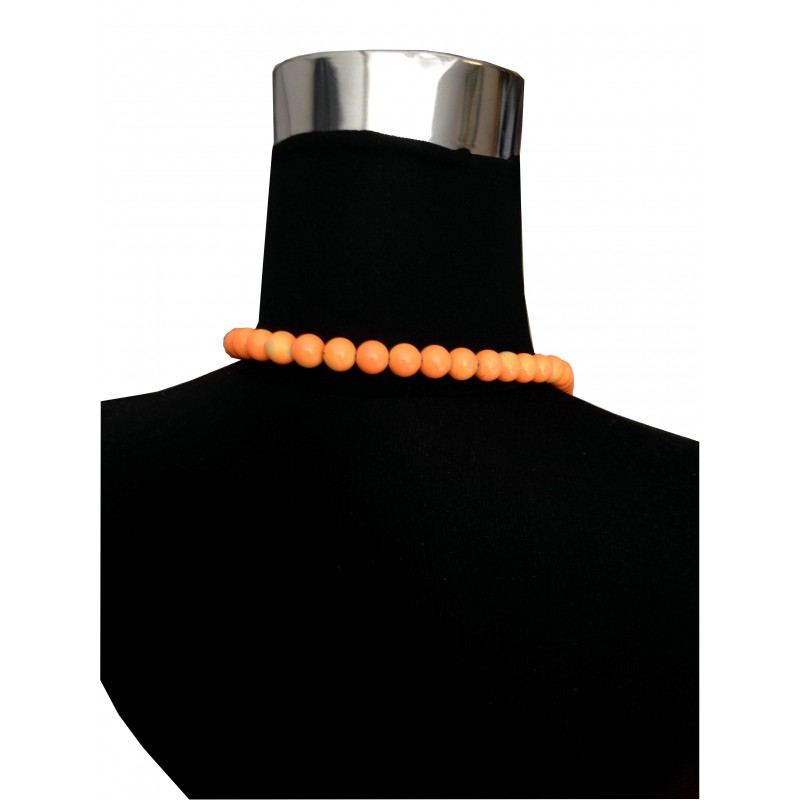 Long necklace, glass pearl / neon orange, glass pearl/white, plastic pearl/red, silk pompon/ neon orange
